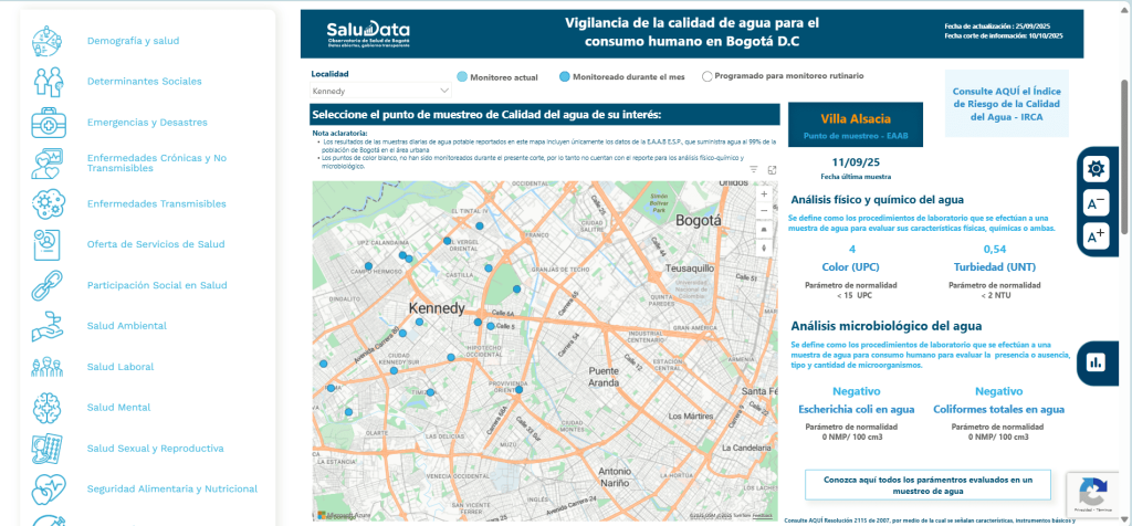 Dentro de ella, el módulo “Vigilancia de la calidad del agua para consumo humano” publica los resultados de los análisis realizados en las diferentes localidades de la ciudad por la Empresa de Acueducto y Alcantarillado de Bogotá.