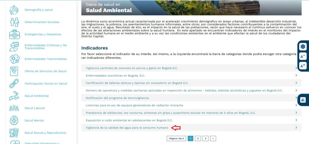 Dentro de las opciones del menú, ingresa a “Salud ambiental” y luego busca el indicador “Vigilancia de la calidad del agua para consumo humano”. Allí verás un mapa interactivo con los puntos de muestreo y resultados por localidad.